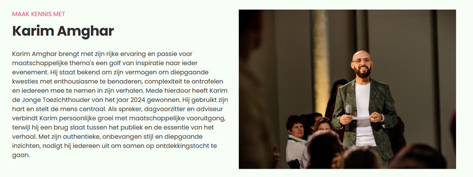Gastspreker Karim Amghar Karim Amghar is een Nederlandse schrijver, programmamaker, televisiepresentator en onderwijsprofessional met een passie voor sociale rechtvaardigheid. Hij maakt gevoelige onderwerpen met energie en betrokkenheid bespreekbaar. Hij combineert wetenschappelijke inzichten met persoonlijke ervaringen en vertaalt deze naar praktische lessen die direct toepasbaar zijn binnen organisaties zoals het onderwijs.